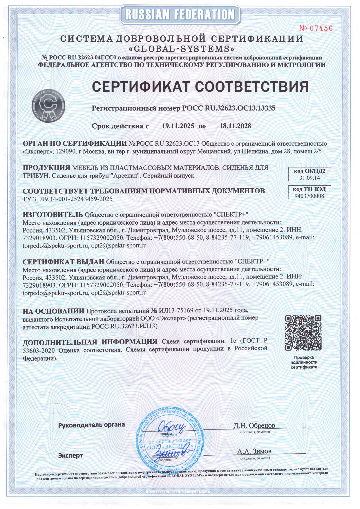 Сертификат соответствия (сиденье Арсенал)